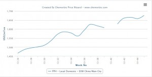 According to data from ChemOrbis Price Index, domestic homo-PP prices in China have been steadily increasing since the last week of June, with the total increase in prices on an ex-warehouse China basis coming to nearly $210/ton over the past four months, pushing prices to their highest levels since August 2011.