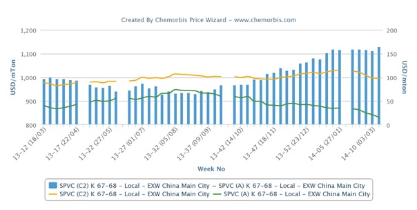 An ethylene based PVC producer in Tianjin reported that ethylene and VCM are still expensive although VCM prices inched down recently. “We are planning to have a turnaround starting this weekend until end March due to high costs,” a producer source said. Spot ethylene costs gained around $35/ton from a month ago on CFR North East Asia basis, while softening $10/ton on the week.