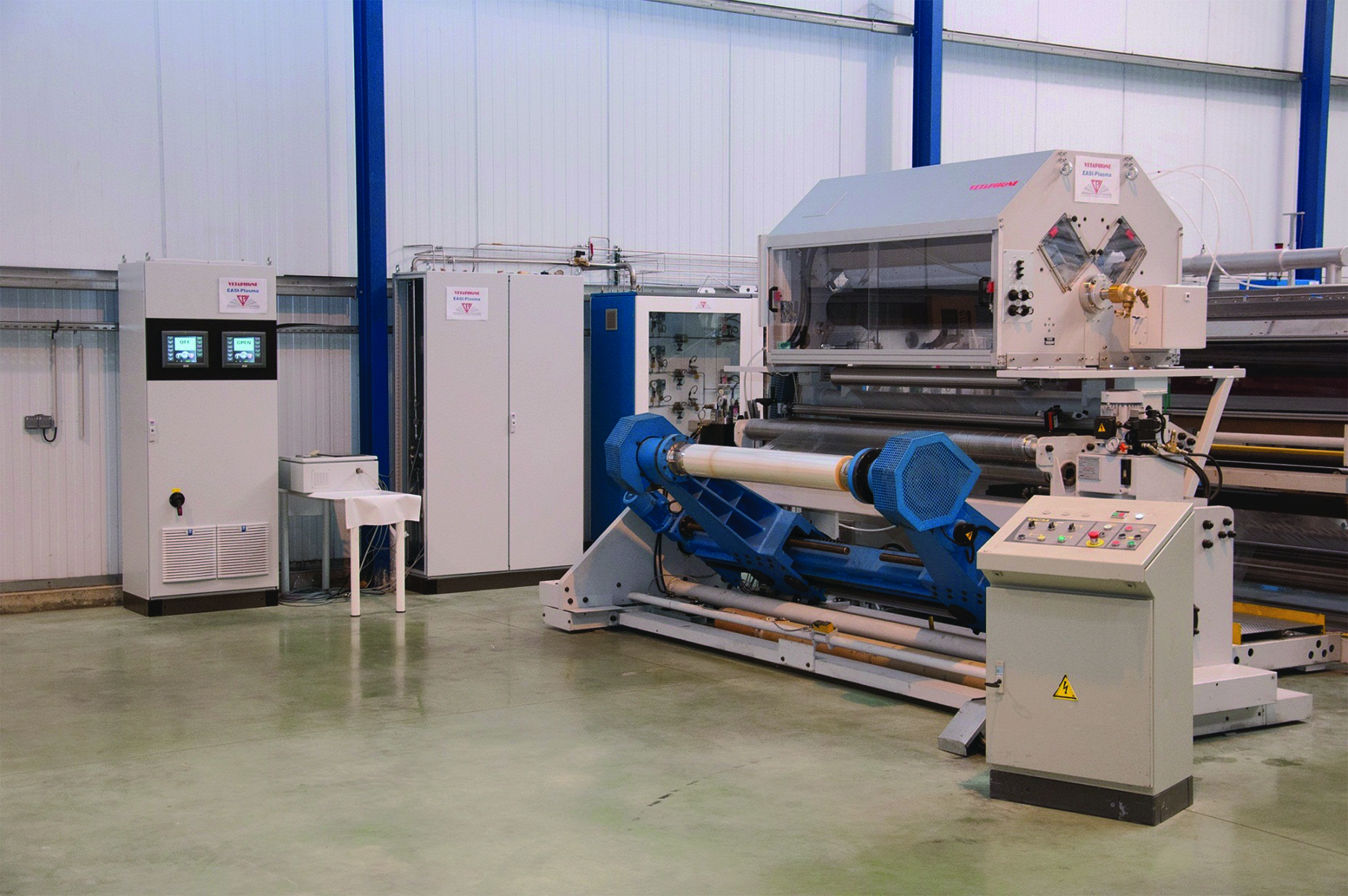 Moving onto the production floor, Eric Gat showed a diagram that illustrated how the process worked inside the EASI-Plasma station, pointing out the critical part played by its ability to adjust the gap between the rollers and the electrodes. The Quick Change Cassette, which was originally designed to facilitate cleaning and maintenance, now offers the opportunity to have all processes in one unit. Both Gas Controller and iPLASMA Generator have touchscreen control panels. These offer precise management control of each job, and provide a production log for repeat work and performance assessment, as well as a suggested maintenance schedule.