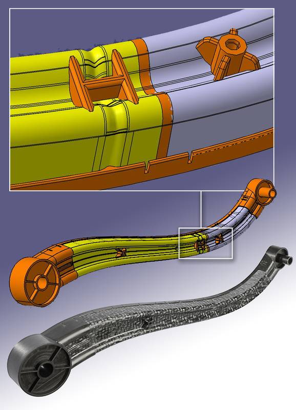As the temperature of the organic sheets is only slightly below the melting temperature of the base polymer, a perfect bond is ensured. For the same reason it is also possible to produce moulded-on elements (e.g. screw bosses) by injecting through the organic sheet without causing any damage to the fibre structure in the moulded part. In order that it can be connected to a mating part in a downstream process, the demonstration lever is provided with a corresponding hole during the moulding operation without adversely affecting the fibre structure.